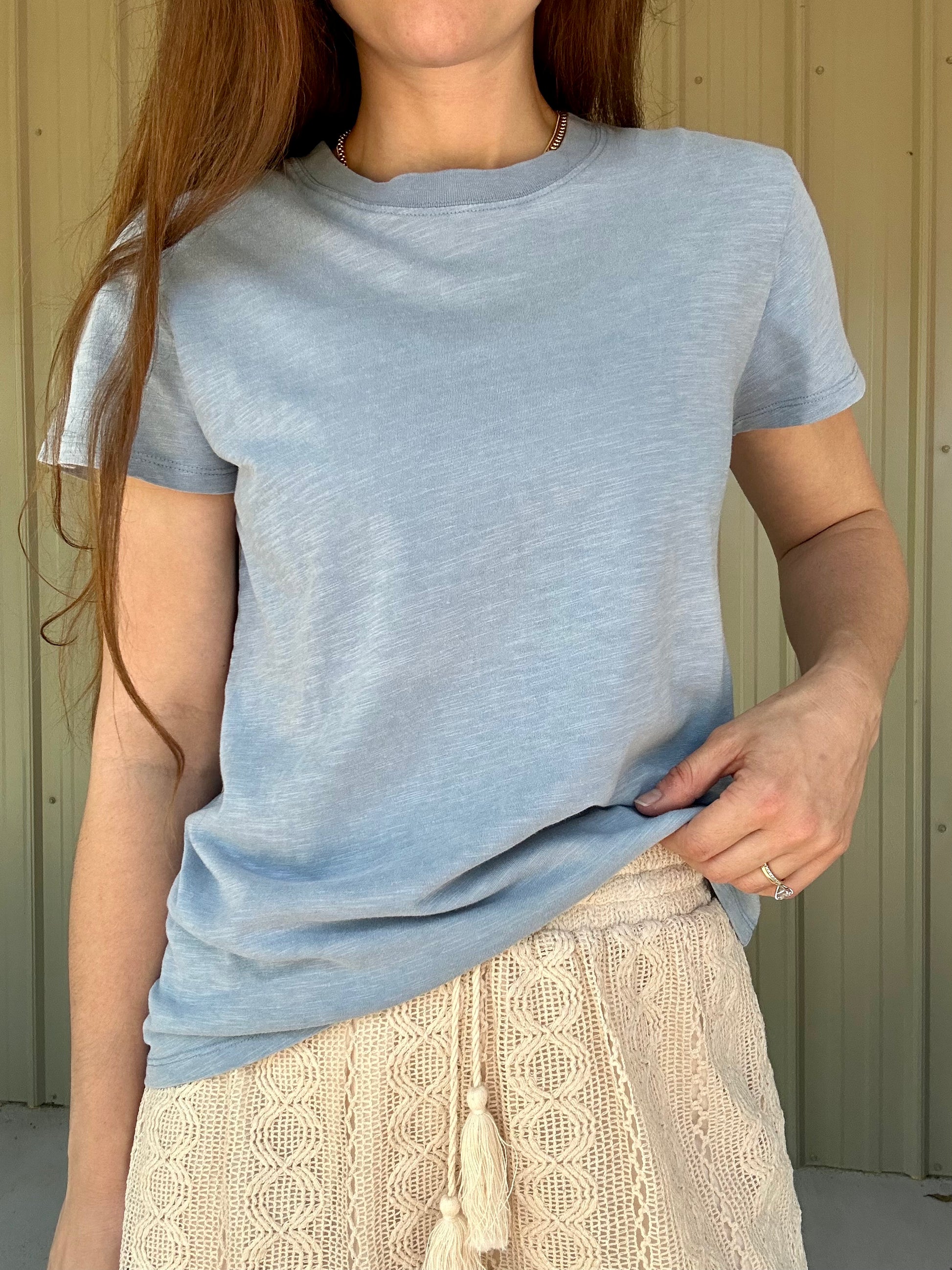 It’s the kind of tee that works year-round: layer it under jackets, tuck it into jeans, or wear it loose with lounge shorts. Its timeless cut and soothing color make it a staple that feels both easy and elevated.