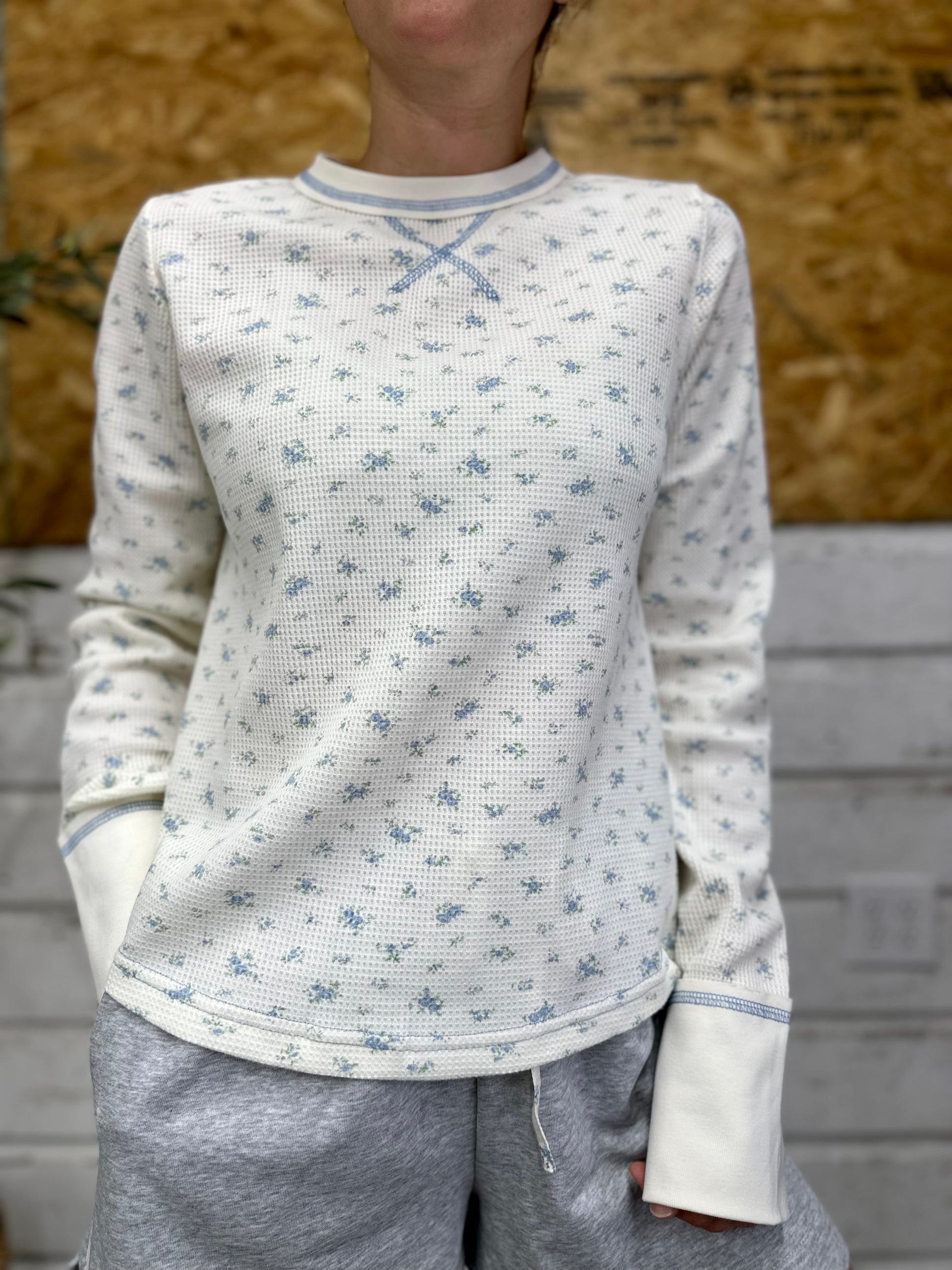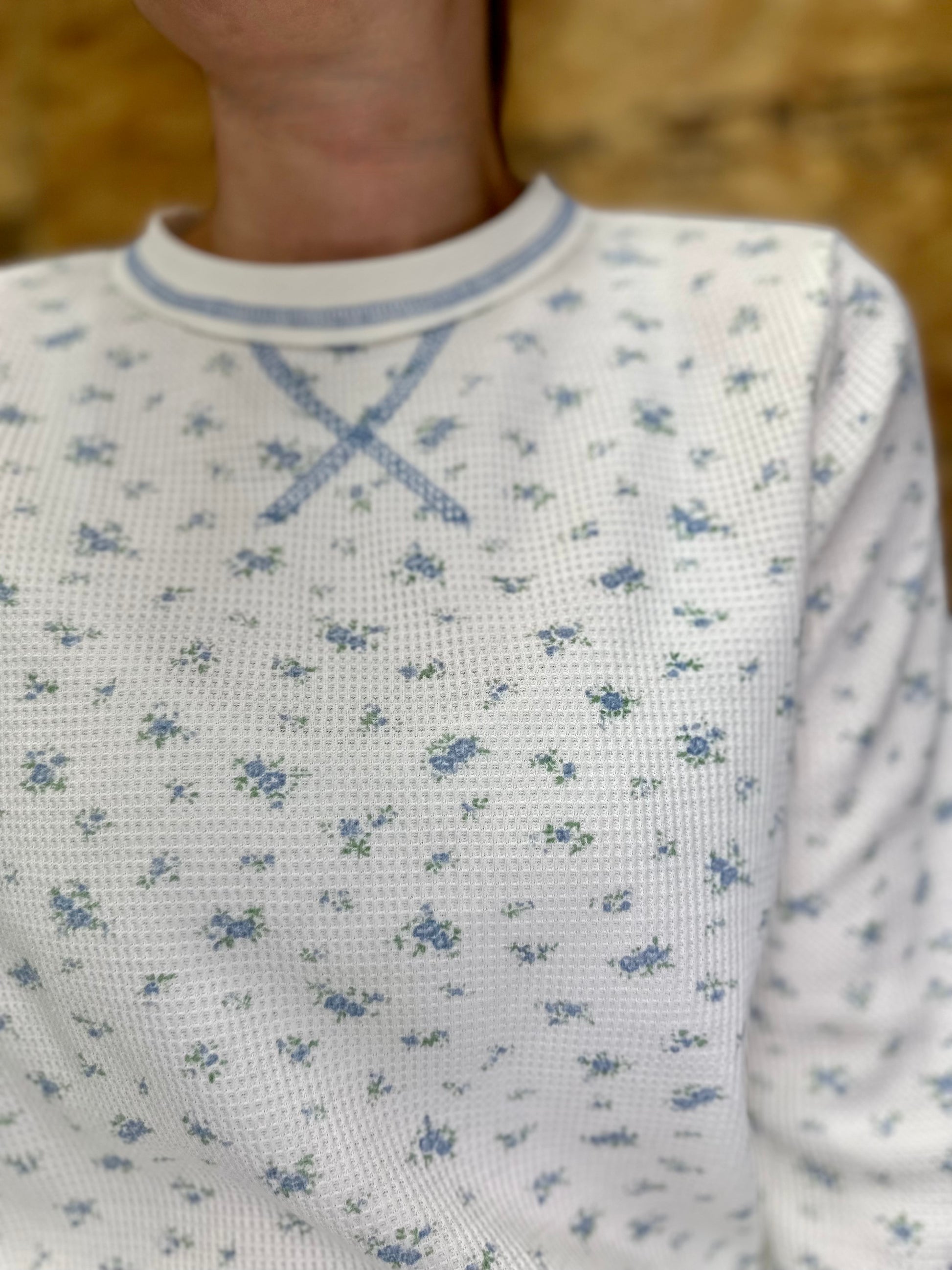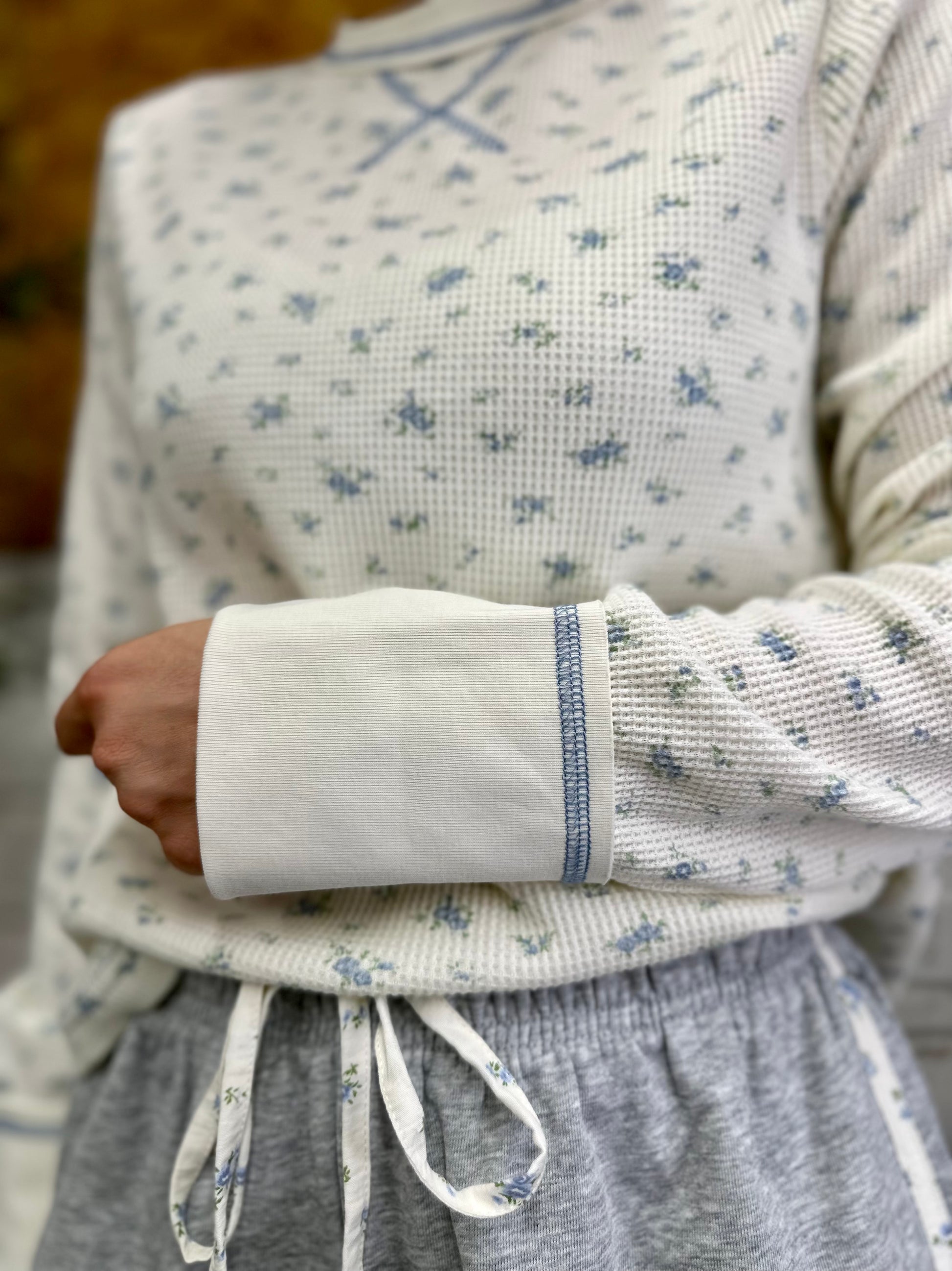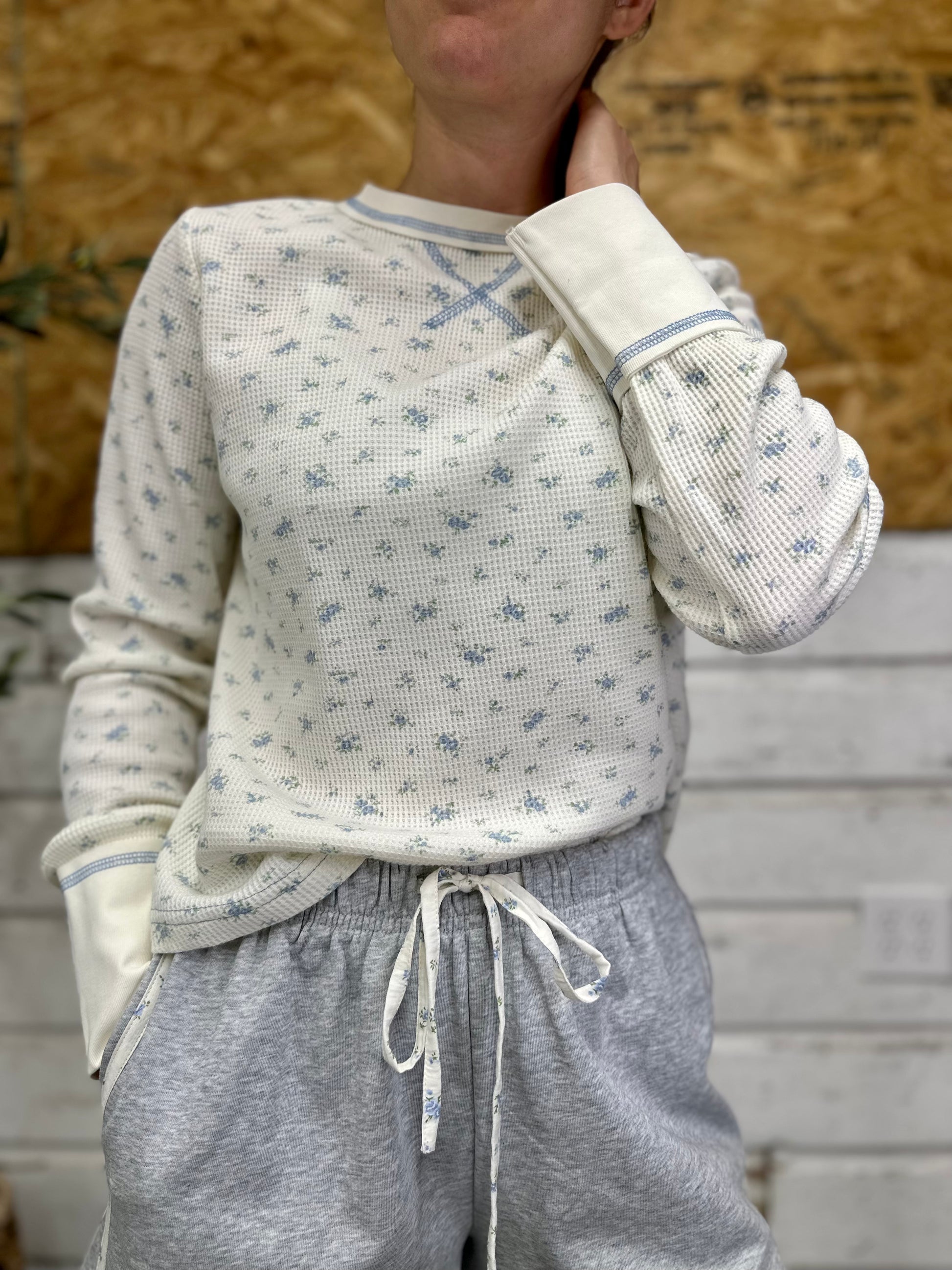 Soft, sweet, and made for slow days—the Ditsy Blue Floral Top is your cozy go-to. Made from a lightweight thermal fabric, it features a charming blue ditsy floral print and delicate contrast blue stitch detailing that adds a subtle, thoughtful finish. The relaxed fit makes it easy to wear on its own or layered. Easily take this piece from season to season. Even better? It pairs perfectly with the matching shorts for a full set moment that feels as good as it looks.