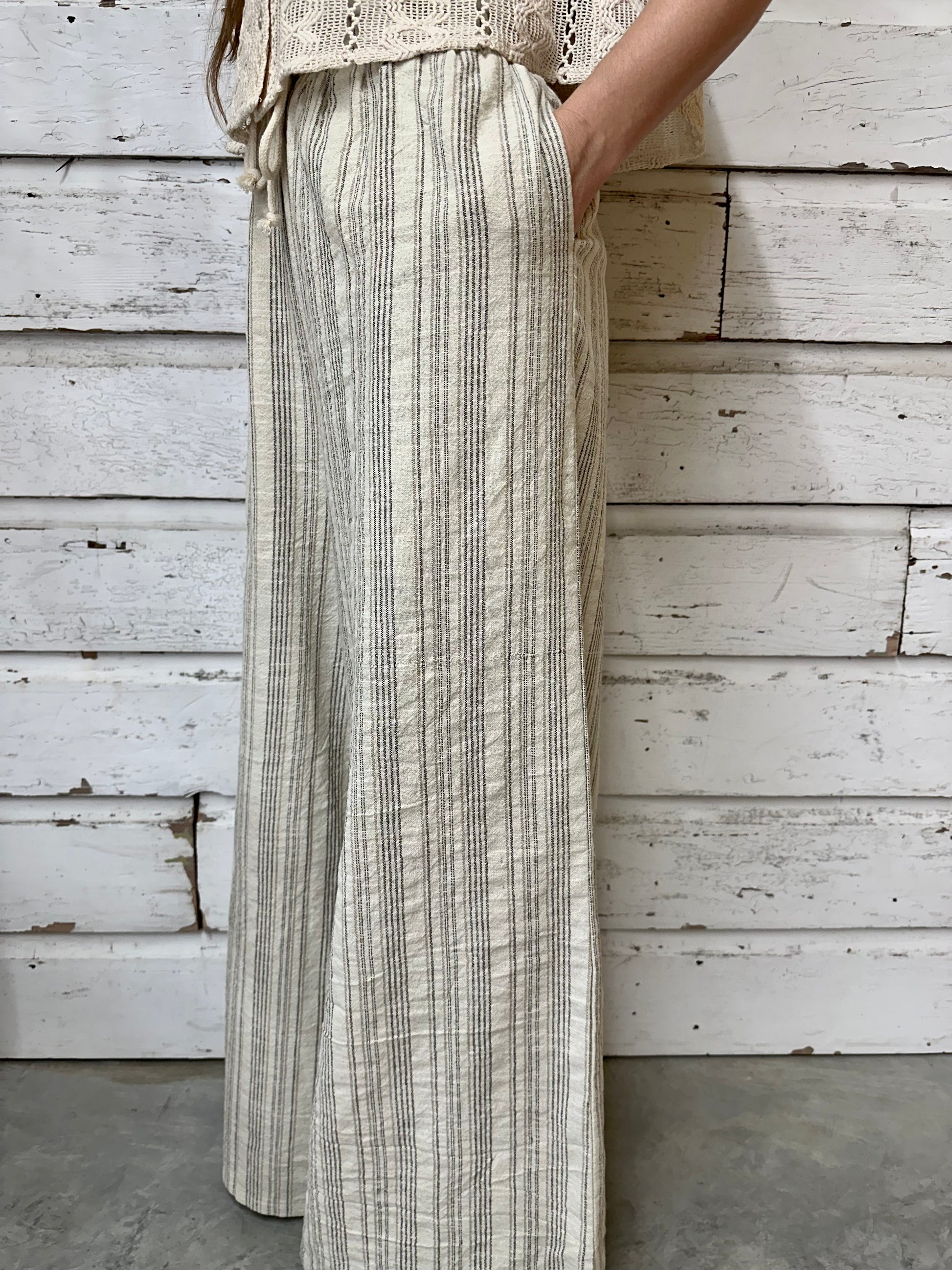 Effortlessly timeless and softly tailored, the Maison Stripe Linen Blend Pants bring a touch of French-inspired charm to your everyday wardrobe. Made from a breathable cotton-linen blend and lined for coverage and comfort, these lightweight trousers feature a soft ivory base with delicate blue and taupe striping — a palette that feels calm, classic, and endlessly wearable.