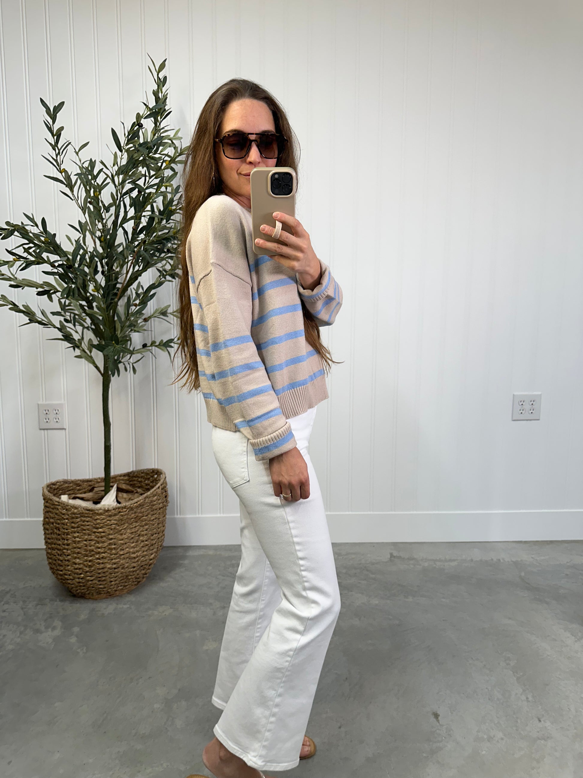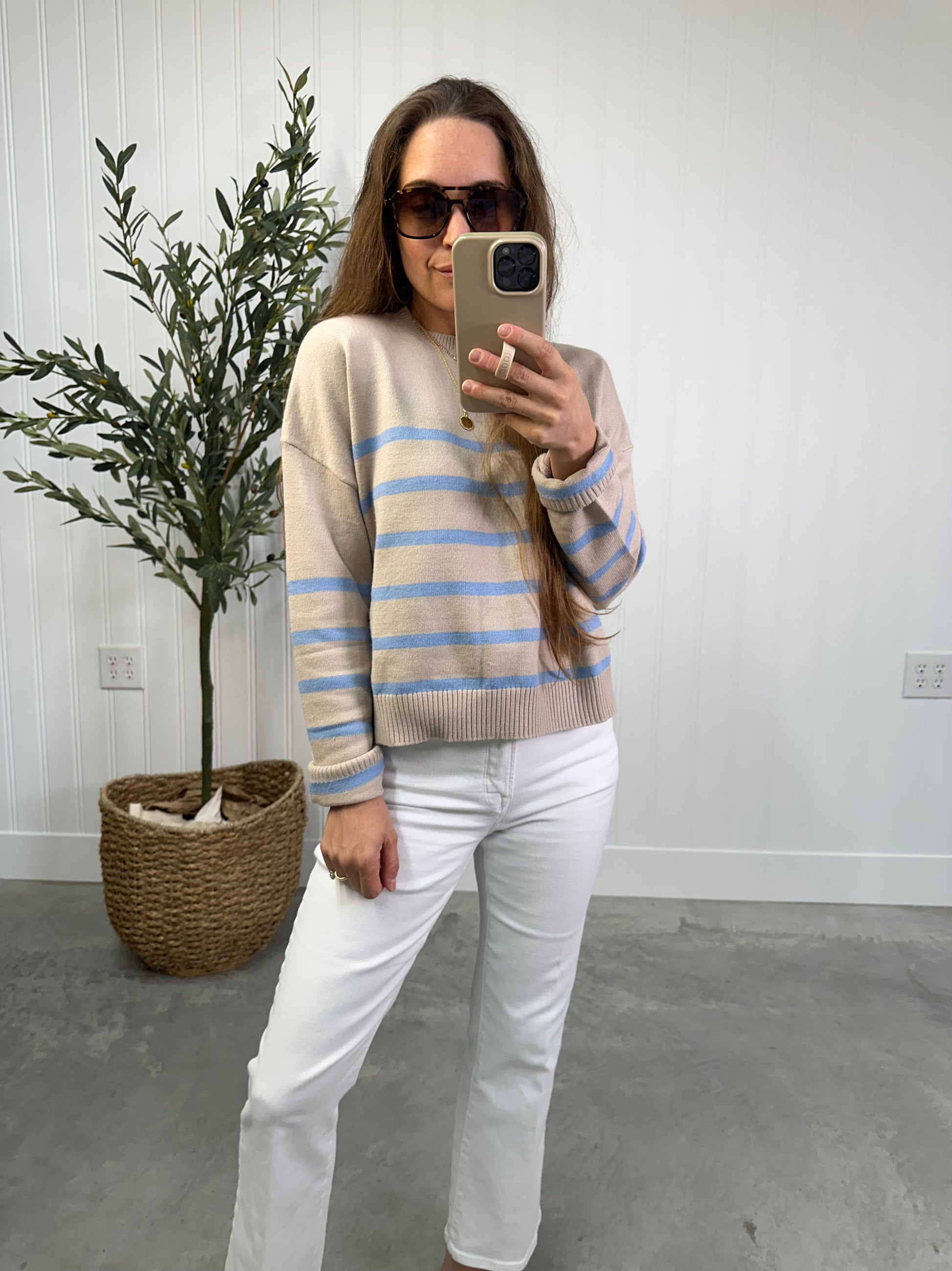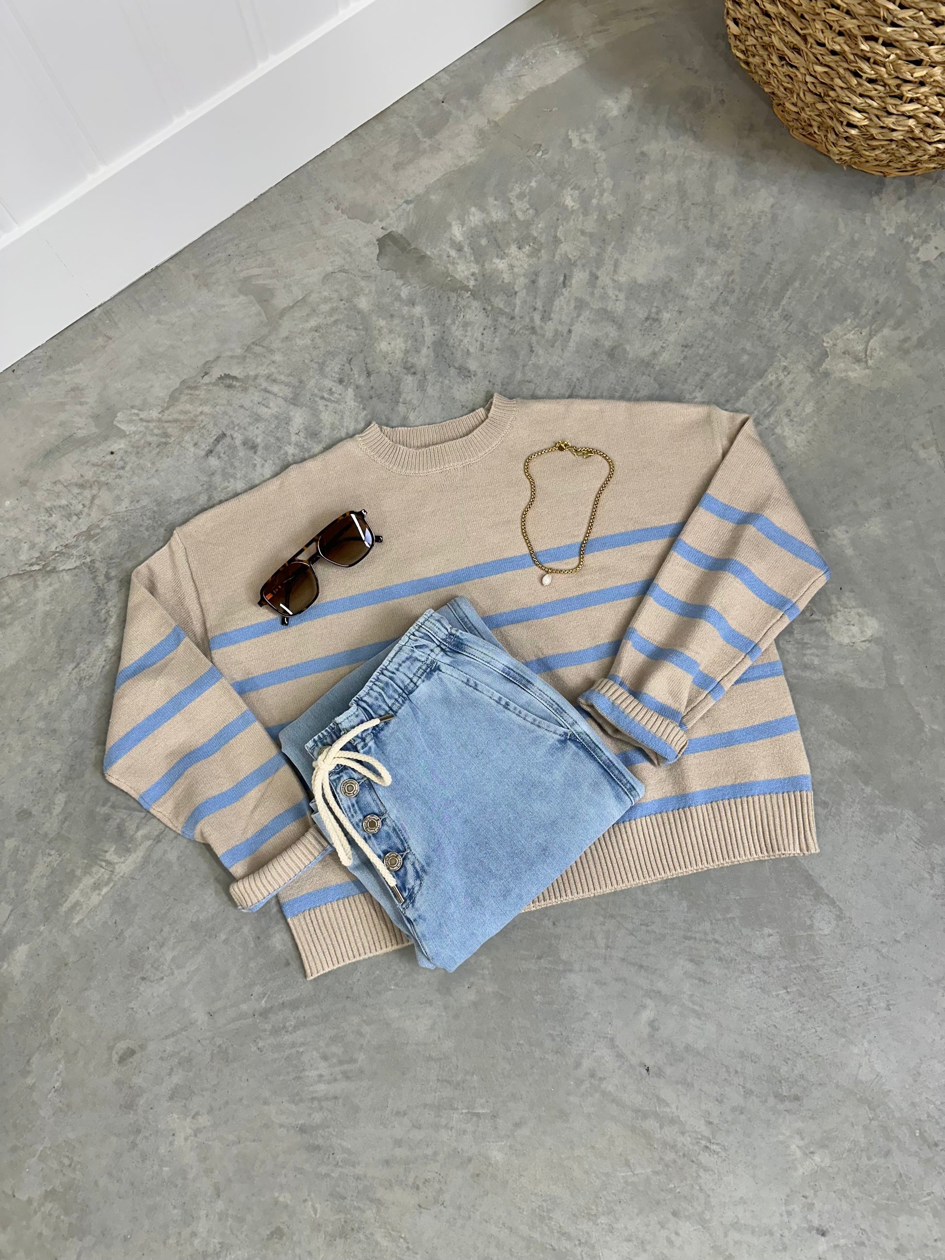 - Creamy stone & sky blue stripes